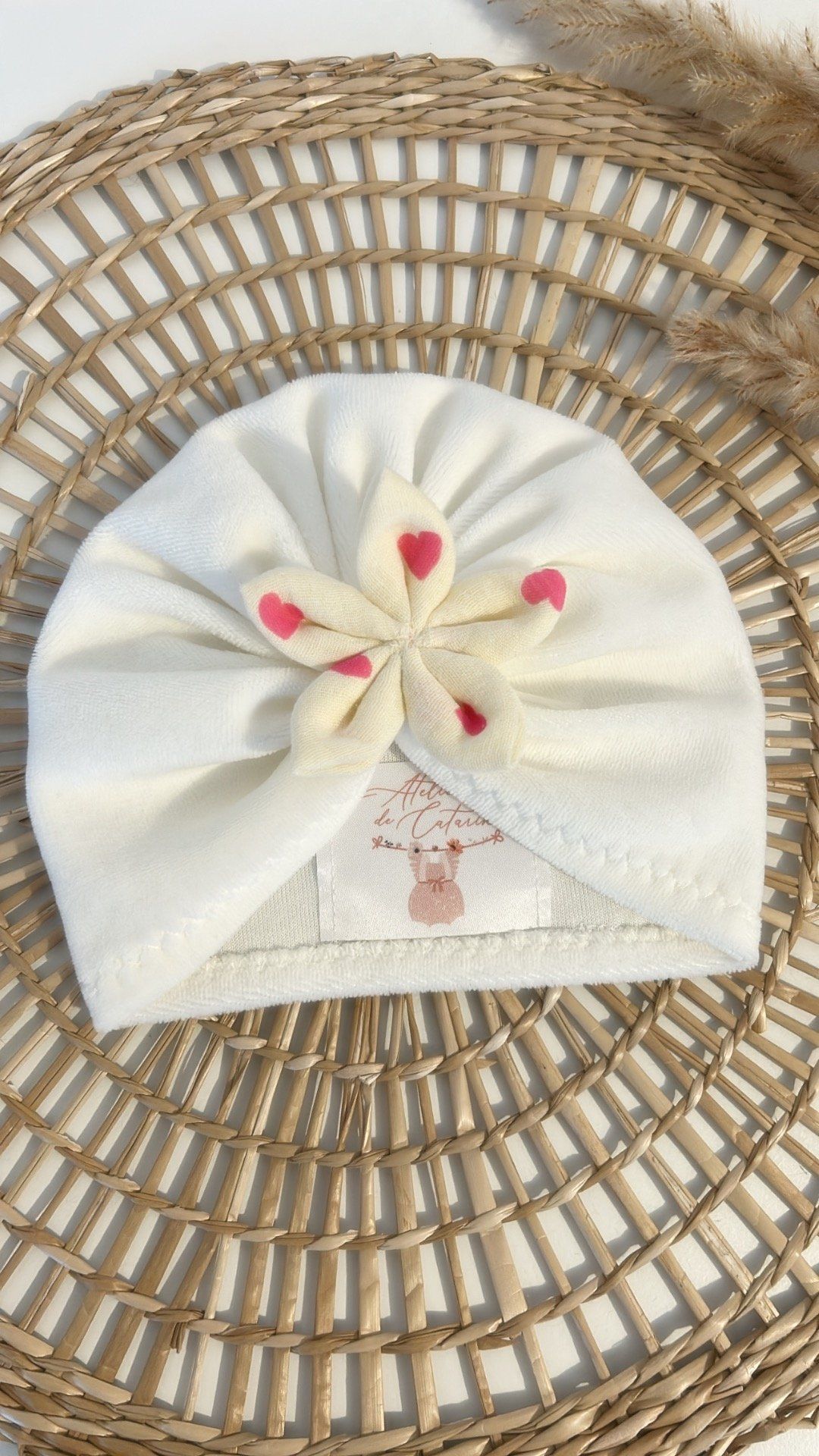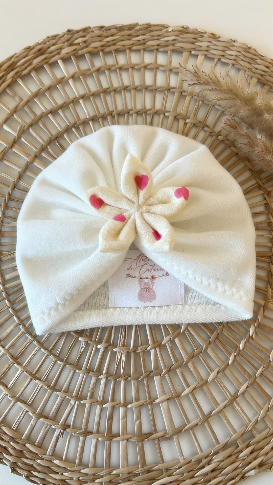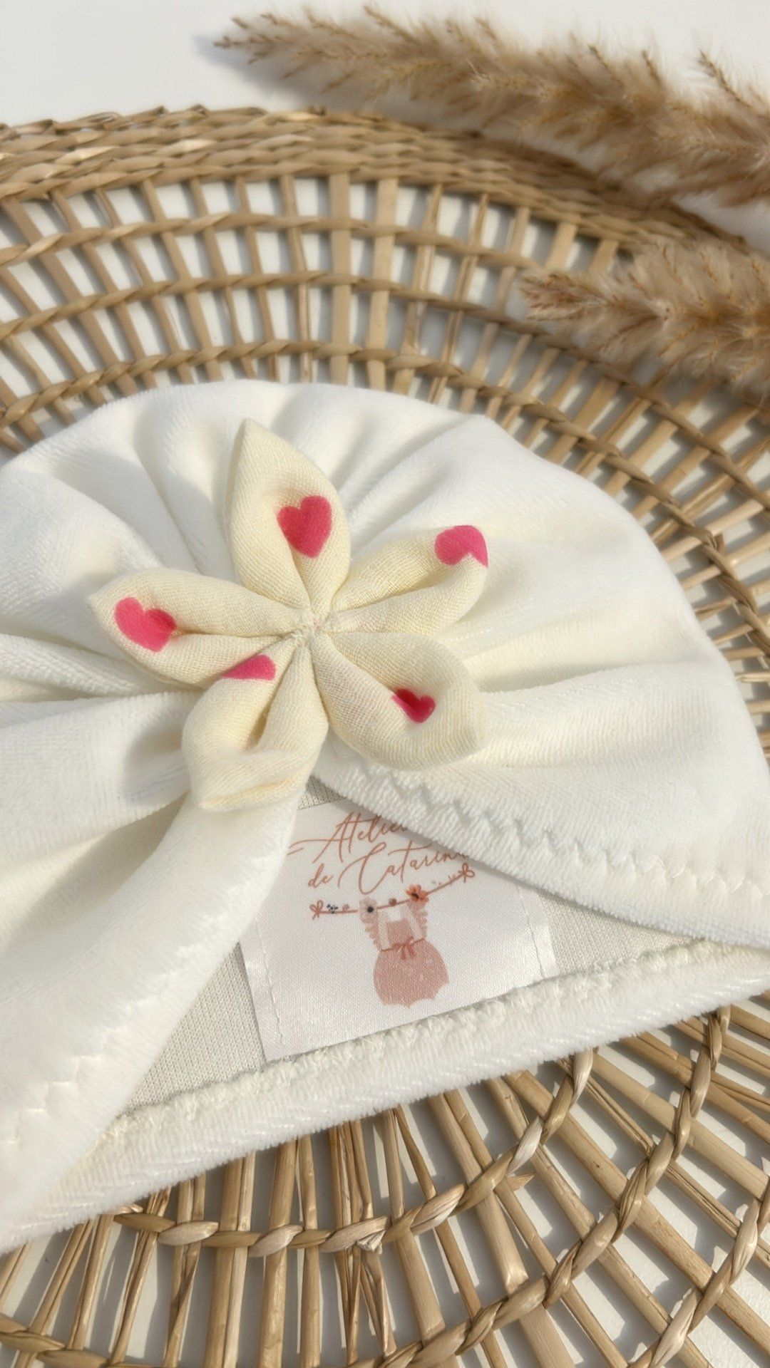 ✨ Confectionné à la main en velours tout doux, orné d’une fleur en tissu avec des cœurs rose .